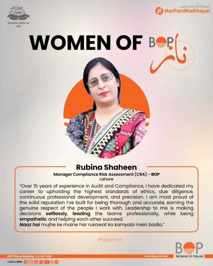 Rubina Shaheen is the Manager of Compliance Risk Assessment (CRA) at The Bank of Punjab (BOP) in Lahore. She was recently featured by the bank as part of their 2026 Women’s Day series, celebrating female leaders within the institution.  Professional Background & Role Experience: She has over 15 years of experience in the fields of Audit and Compliance. Key Skills: Her role involves maintaining high ethical standards, precision, and building trust among stakeholders through effective compliance management. Previous Responsibilities: According to her professional profile, she has also served as an Assistant Manager in the Policy Review Unit, where she was responsible for preparing executive summaries of audit reports and maintaining MIS for management audits. Professional Experience The Bank of Punjab (BOP) Manager, Compliance Risk Assessment (CRA): Leads compliance risk evaluations and maintains ethical standards within the institution. Assistant Manager, Policy Review Unit (Sep 2020 – Present): Responsible for preparing executive summaries of audit reports and maintaining Management Information Systems (MIS) for management audits. Bank Alfalah Limited Senior Audit Officer (Jul 2011 – Sep 2020): Spent over 9 years conducting branch operations audits and head office unit audits. Key duties included preparing quarterly presentations for audit conferences and handling compliance data for the Board Audit Committee. Kashf Microfinance Bank Limited Operations Officer (Sep 2009 – Jul 2011): Coordinated with the State Bank of Pakistan (SBP) regarding branch licensing and mergers. Monitored Anti-Money Laundering (AML) activities and trained staff on Know Your Customer (KYC) requirements. Kashf Foundation Finance Associate (Jan 2007 – Sep 2009): Managed liquidity positions, fund transfers to branches, and monthly withholding tax (WHT) reconciliations.  Education University of the Punjab: Master of Industrial and Operations Management (MIOM) (2015 – 2019). MSc in Operational Management (2003 – 2005). Key Skills & Certifications Specializations: Internal Audit, Compliance Risk, AML-CFT-CPF regulations, and Operational Risk Management. Core Competencies: Risk assessment, policy review, and strategic stakeholder trust-building.